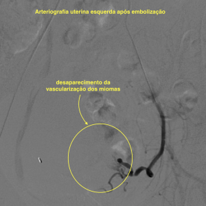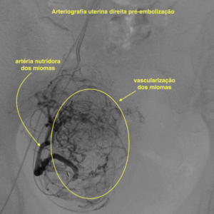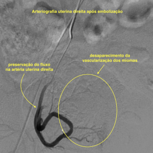 Arteriografia uterina direita durante procedimento de embolização de mioma uterino