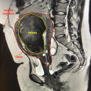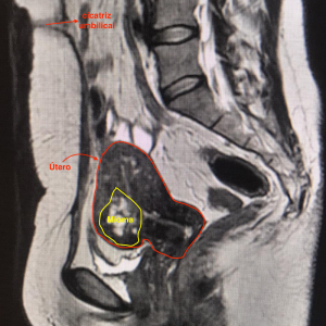 Ressonância magnética após embolização uterina demonstrando importante redução das dimensões do útero e do mioma